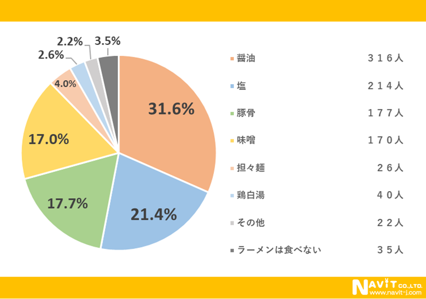 「好きなラーメンの種類は何ですか?」という質問については、「醤油」が31.6%、「塩」が21.4%、「豚骨」が17.7%という結果になり、醤油ラーメンが1番人気だということが分かりました。