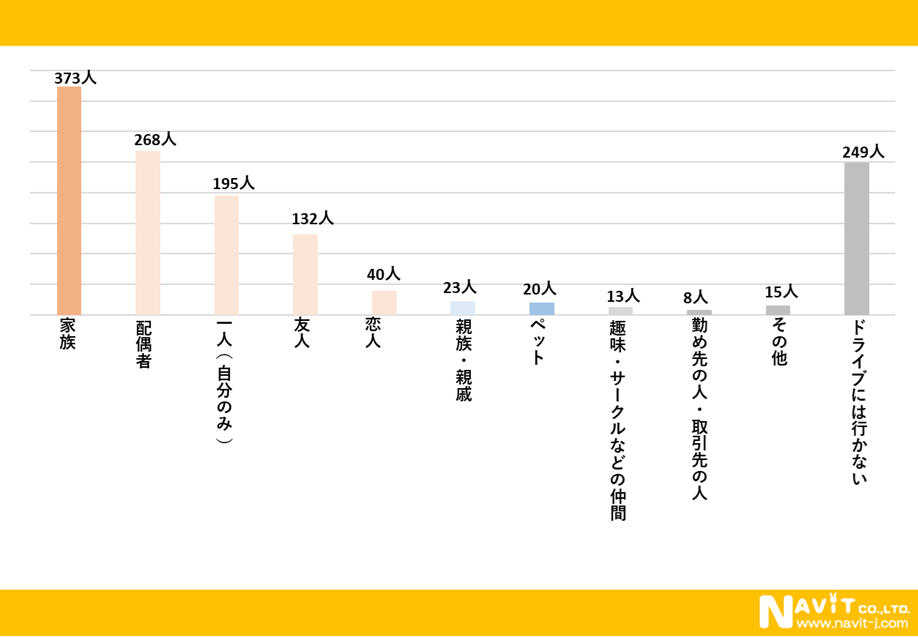 「ドライブへは誰と行きますか?」という質問を複数回答可で行ったところ、「家族」が373人、「配偶者」が268人、「一人(自分のみ)」が195人という順番になりました。ご家族でワイワイドライブするのも、一人で気の向くままにドライブするのも楽しいですよね。