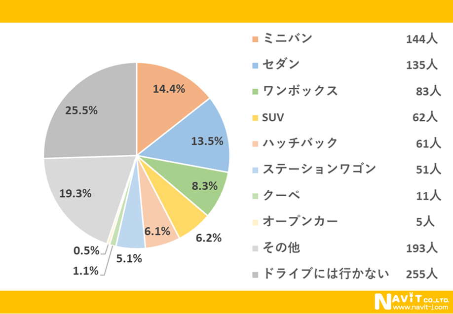 「どんな車でドライブに行きますか?」という質問については、「ミニバン」が14.4%、「セダン」が13.5%、「ワンボックス」が8.3%という順になりました。荷物もたくさん載せられ、複数人でも乗りやすいサイズの車はドライブにぴったりですね。