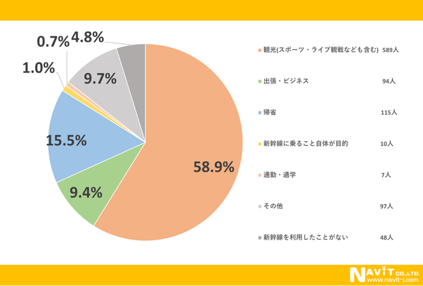 新幹線利用の目的をきいたアンケートで1番多かったのが「観光(スポーツ・ライブ観戦なども含む)」で58.9%という結果になりました。続いて「帰省」が11.5%で「出張・ビジネス」が9.4%と続いています。仕事での利用が多いイメージがありましたが、意外とそうでもないようです。