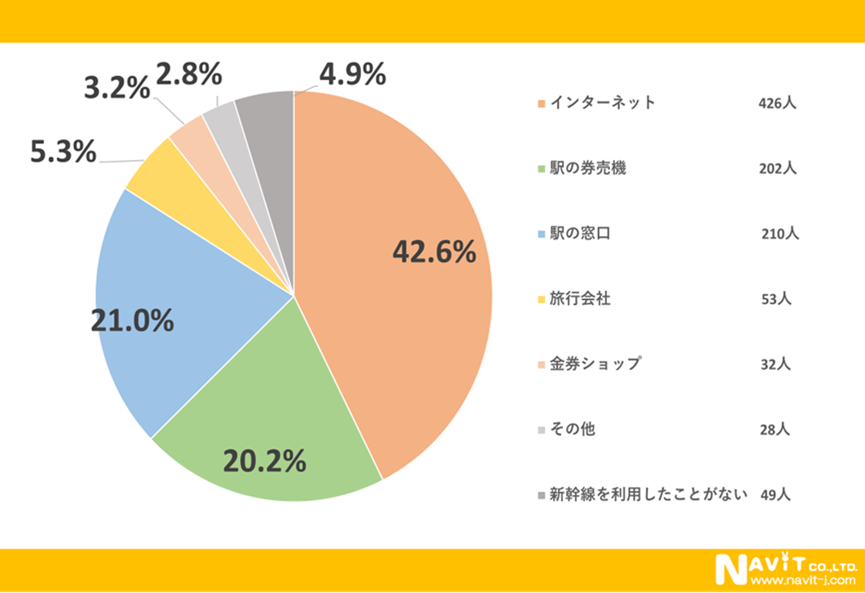 新幹線の切符購入に関するアンケートでは「インターネット」と回答された人が1番多く42.6%でした。次に多かったのが「駅の窓口」で21.0%、続いて「駅の券売機」が20.2%と続きました。