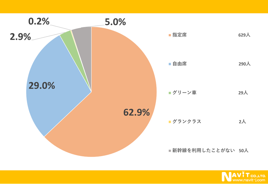 新幹線の席種を選ぶ際のポイントは移動時間にもよるでしょうが、今回のアンケートでは「指定席」を選んだ人が1番多く62.9%という結果になりました。次に多かったのが「自由席」で29.0%、続いて「グリーン車」が2.9%という結果になりました。