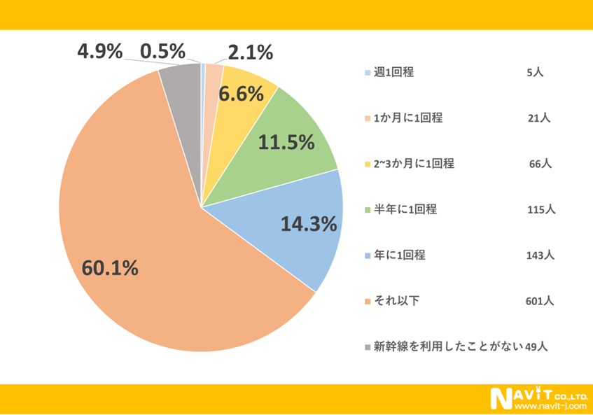 新幹線の利用頻度についてのアンケートで1番多かったのは「それ以下」と1年に1回も乗らないという人が60.1%と1番多い結果になりました。次に多かったのは「年に1回程度」という人が14.3%、続いて「半年に1回程度」が11.5%という結果になりました。