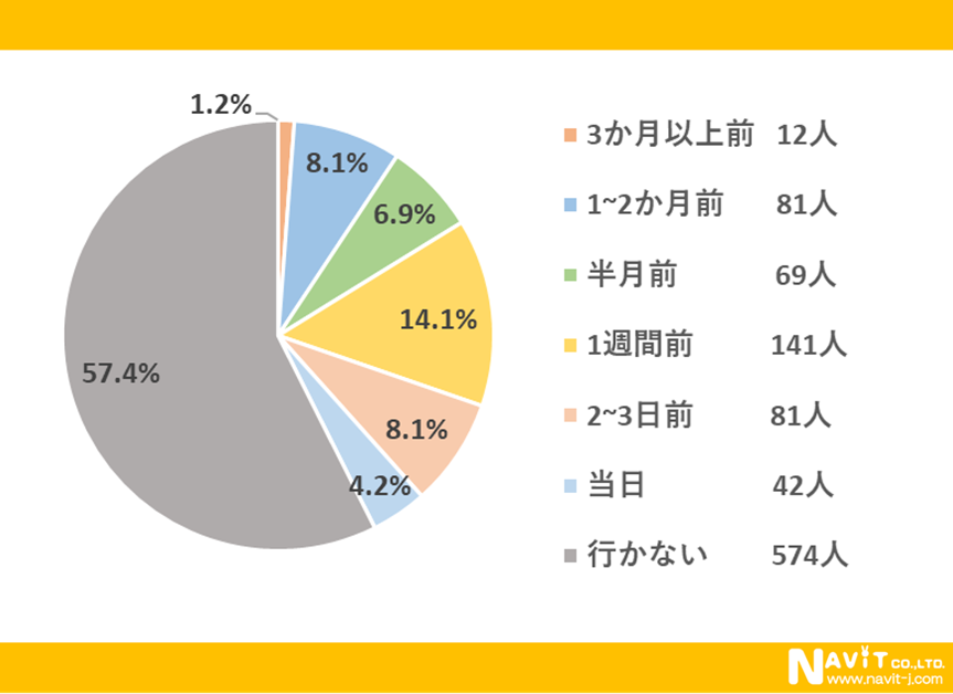 「いつ頃から予定を立てますか?」という質問については、「1週間前」が14.1%、「1~2ヶ月前」「2~3日前」が8.1%と並ぶ結果になりました。