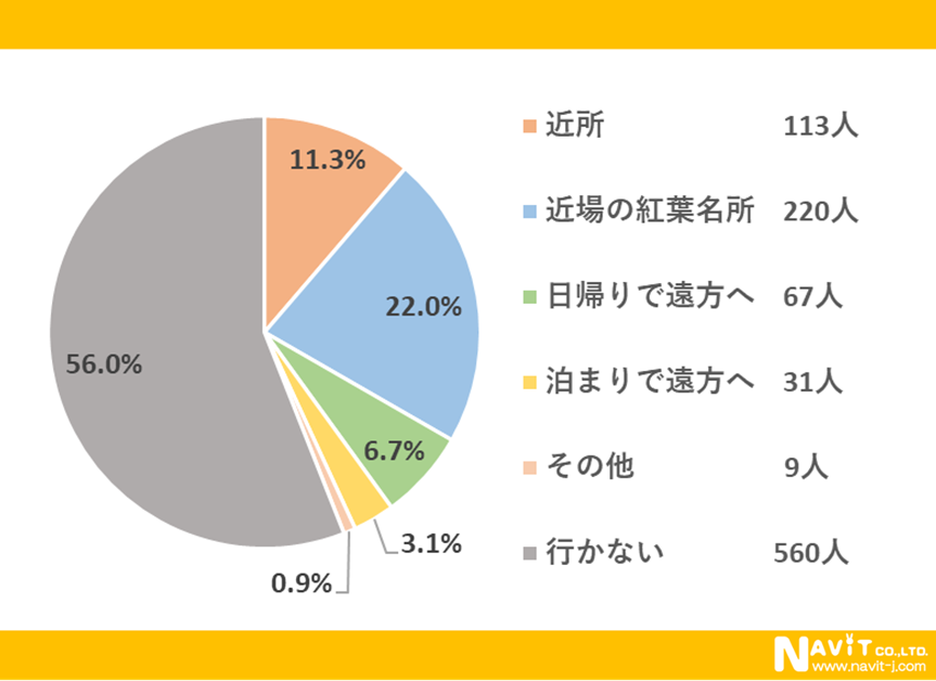 「どこに紅葉を見に行きますか?」という質問については、「近所の紅葉名所」が22.0%、「近所」が11.3%、「日帰りで遠方へ」が6.7%と続く結果になりました。遠方ではなく近所や近場で紅葉を楽しむ人が多いようですね。