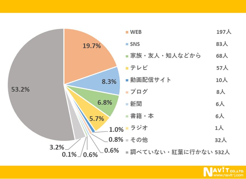 「どのように紅葉スポットを調べていますか?」という質問については、「WEB」が19.7%、「SNS」が8.3%と続く結果になりました。インターネットやSNSで調べる方が多く、書籍や本で調べる方は0.6%まで減少しました。