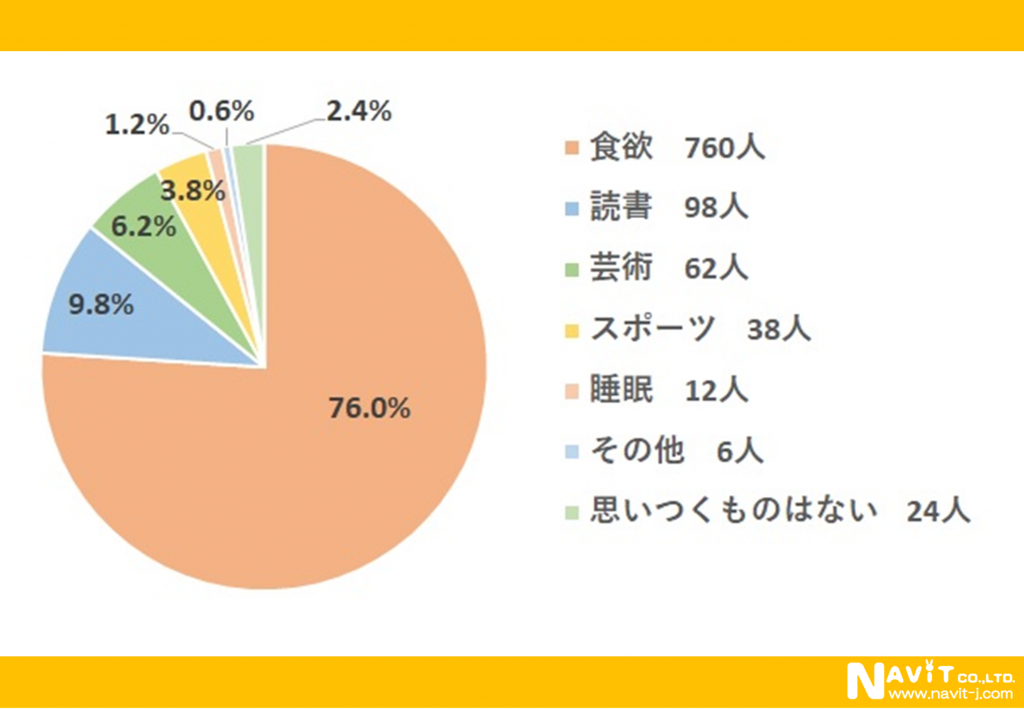 最も多かったのは「食欲」で760人。「読書」(98人)や「芸術」(62人)、「スポーツ」(38人)など他を大きく引き離しています。