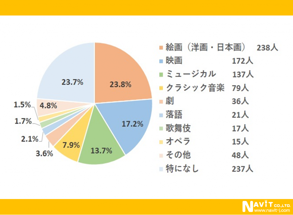 行ってみたい芸術鑑賞のトップは「絵画(洋画・日本画)」で238人。「映画」(172人)、「ミュージカル」(137人)がこれに続きます。