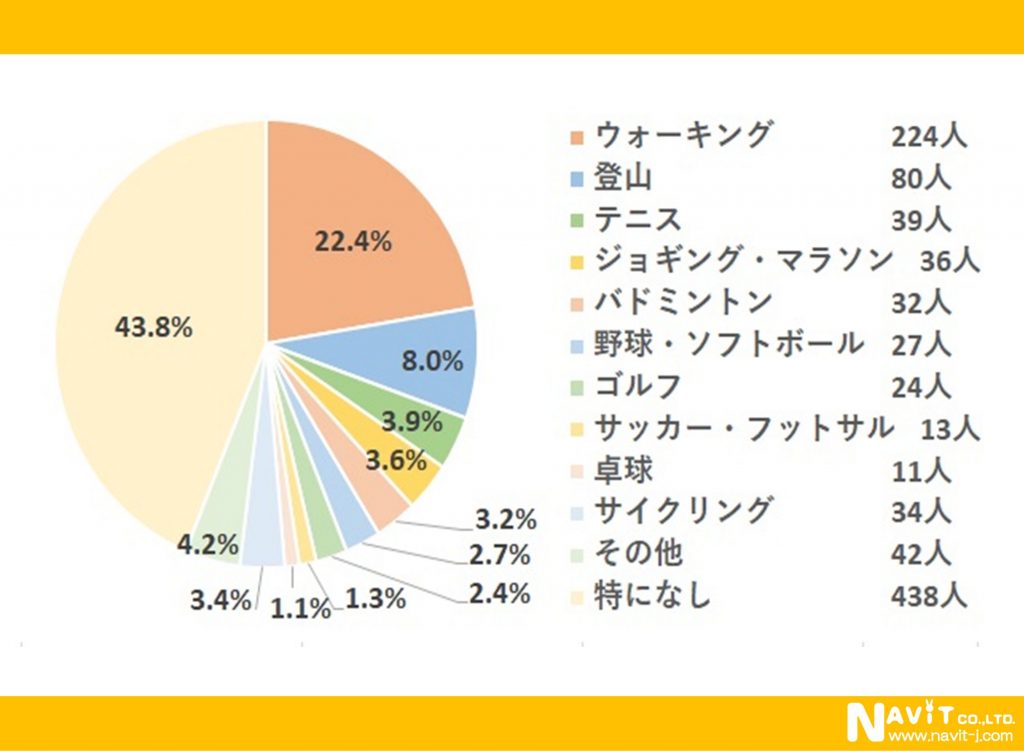 やりたいスポーツのトップに挙がったのは「ウォーキング」で224人。2位以下は「登山」(80人)、「テニス」(39人)、「ジョギング・マラソン」(36人)、「バドミントン」(32人)などとなっています。
