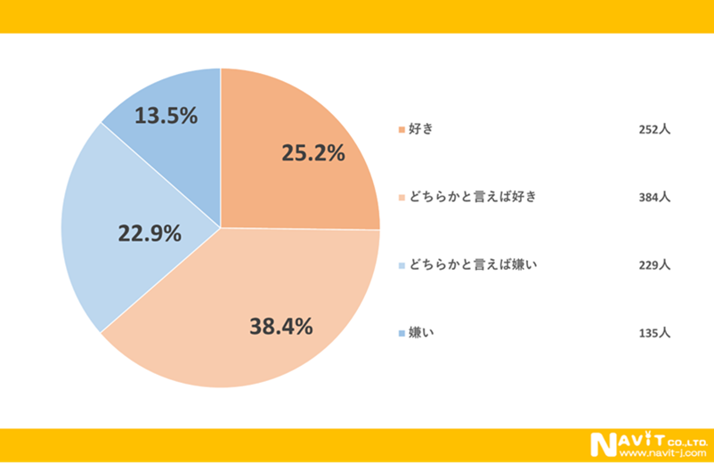 豆乳が好きですか?というアンケートに対して「どちらかと言えば好き」と回答された人が1番多く、38.4%という結果になりました。また「好き」と回答された人は25.2%となり、全体で半分以上の人は豆乳が好きなようです。