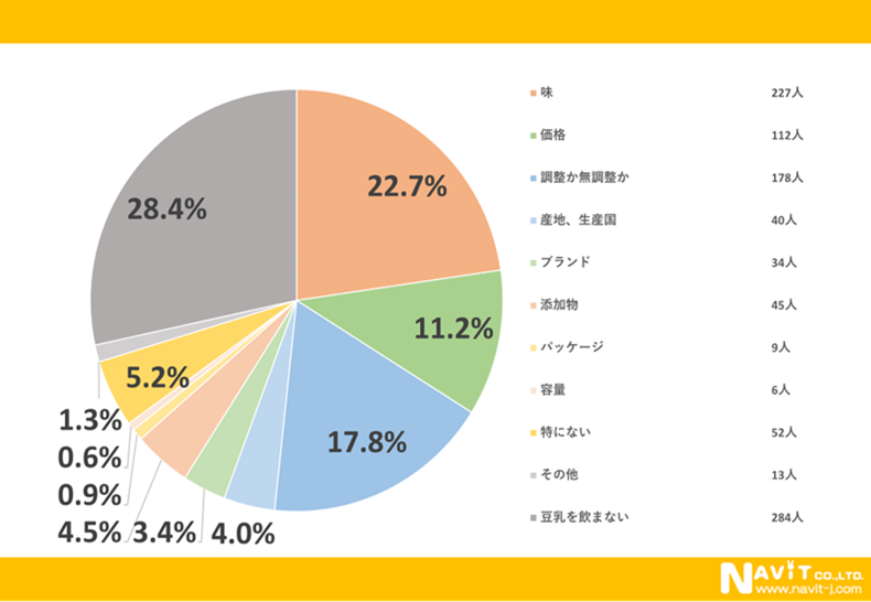 豆乳を購入する際の指標についてのアンケートでは「味」が1番多く22.7%という結果になりました。次に「調整か無調整か」が17.8%で、普段は1位に入りやすい「価格」が11.2%という結果になりました。