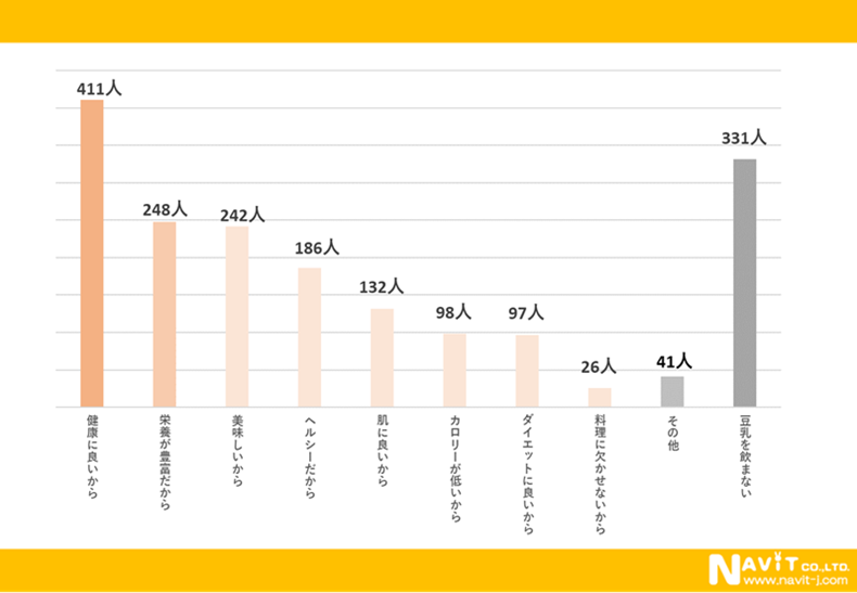 豆乳を飲む理由を複数回答で尋ねたアンケートで1番多かった回答は「健康に良いから」で411人でした。次に多かったのは「栄養が豊富だから」で248人となっています。3番目は「美味しいから」で242人という結果になりました。