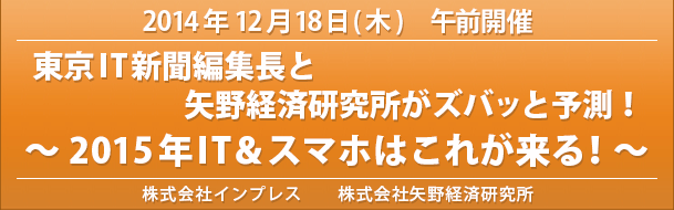 2014年、IT業界は想像を越える変貌を遂げました。 このことから2015年も更なる変貌が続く事が予想されます。 東京IT新聞編集長と、矢野経済研究所より、それぞれの視点で 2014年を振り返り、2015年の注目分野と展望を予測します。 一足早い戦略立案の材料として、お役立て下さい。 大変希少なセミナーとなっております。是非、ご参加下さい。