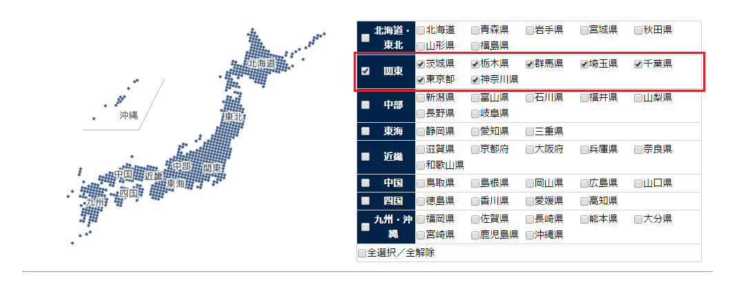 どの地域の法人の情報を検索するか選択します。検索したい都道府県名の左横にあるチェックボックスをクリックして選択し、検索する地域を設定します。