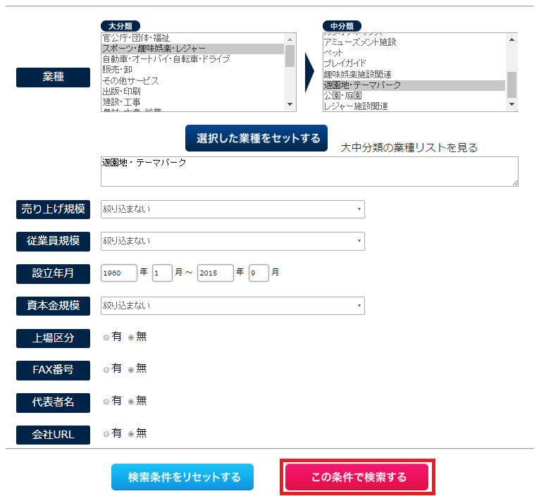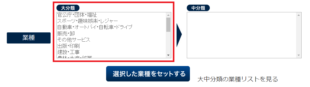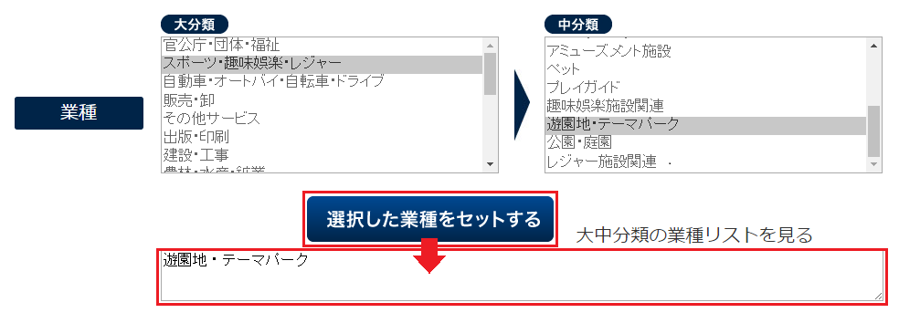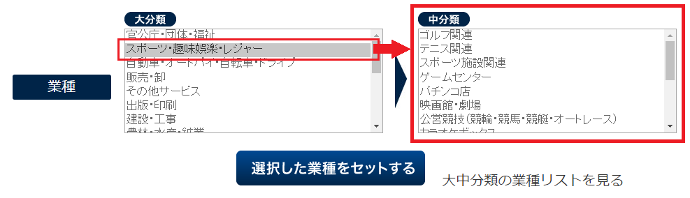「選択した業種をセットする」ボタンをクリックすると、検索条件に業種が設定されます。複数の中分類をセットすることができます。