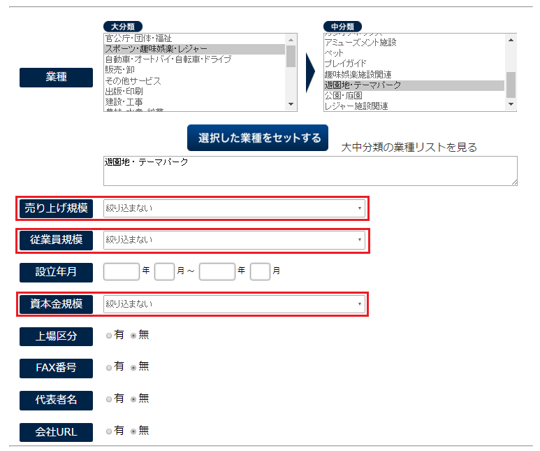 売り上げ規模、従業員規模、資本金規模は各区分で絞り込むことができます。