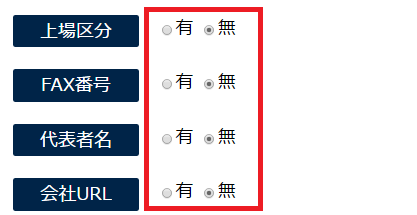 上場区分、FAX番号、代表者名、会社URLは、情報を保持しているデータのみ抽出の場合は「有」を情報を保持していないデータのみ抽出の場合は「無」を選択してください。