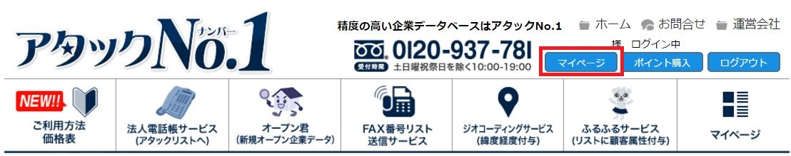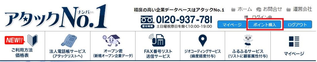 アタックナンバーワンにログインして、画面上部にあるポイント購入をクリックします。