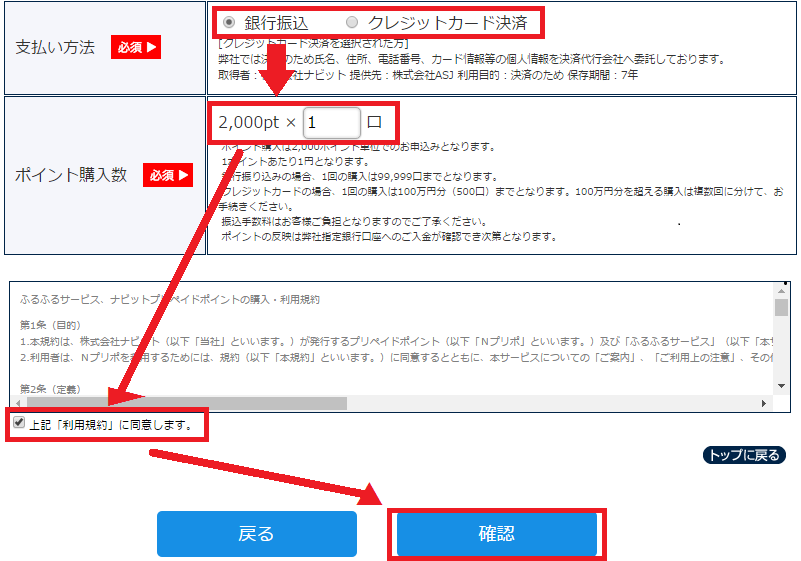 「ポイントの購入お申込み」画面よりポイントの購入方法を選択し、ポイントの購入数を入力して、購入手続きに進みます。(ポイントの購入が初めての方は、利用規約への同意が必要です)