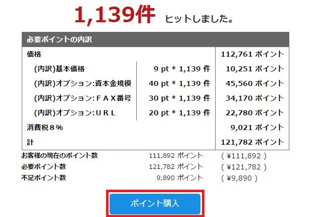 検索結果のデータを購入するために必要なポイントが足らない場合、「ポイントを購入する」ボタンが表示されます。「ポイントを購入する」ボタンを押して、ポイントのご購入手続きにお進みください。