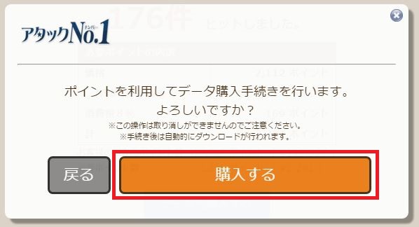 検索結果のデータを購入するために必要なポイントがある場合、「データを購入する」ボタンが表示されます。「データを購入する」ボタンを押すと、確認メッセージが表示されます。