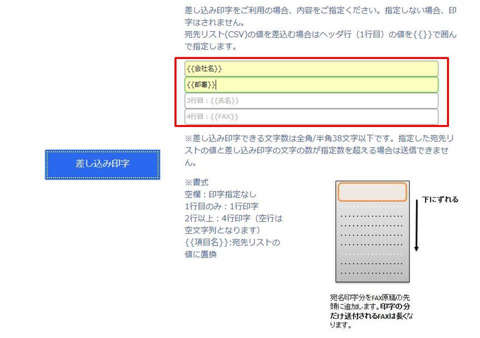 差し込み印字を行う場合、印字スペース分だけ原稿が長くなりますのでご注意ください。