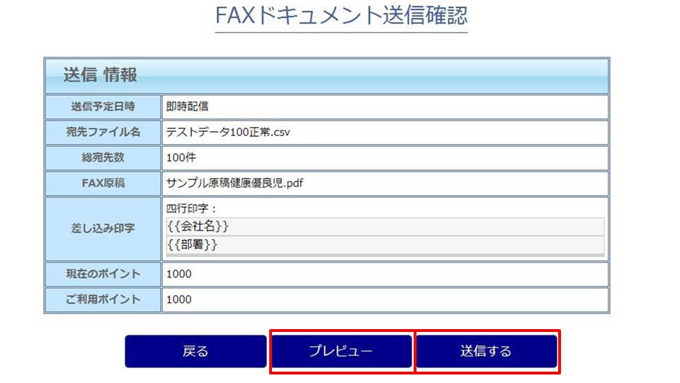 送信宛先分のポイントがある場合、FAXドキュメント確認ページで送信する内容を確認します。「プレビュー」をクリックすると、送信される原稿のイメージを確認することができます。差し込み印字を指定している場合は、差し込み印字が差し込まれた原稿のイメージが表示されます。(原稿のファイルサイズが大きい場合、表示まで時間がかかる場合があります)