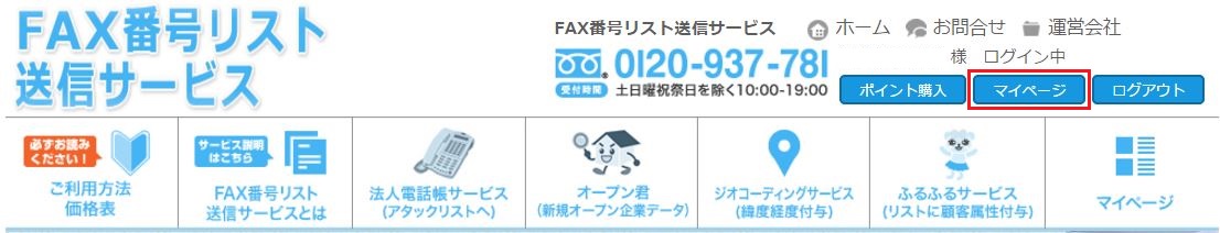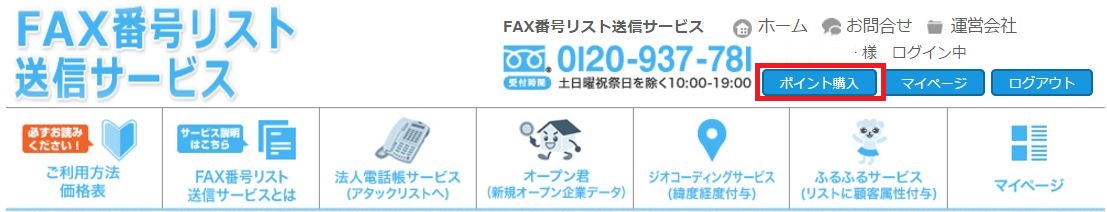 FAX番号リスト送信サービスにログインして、画面上部にあるポイント購入をクリックします。