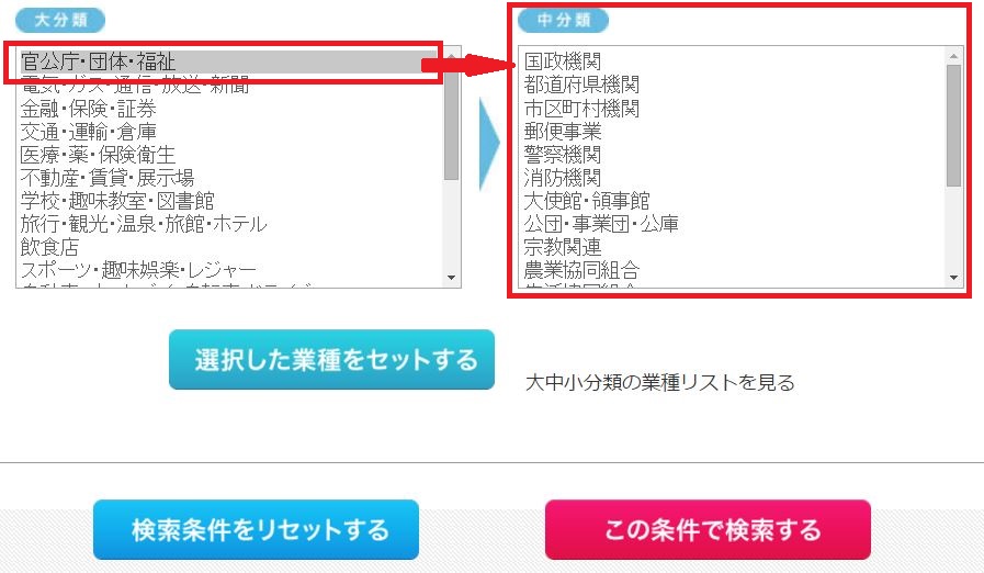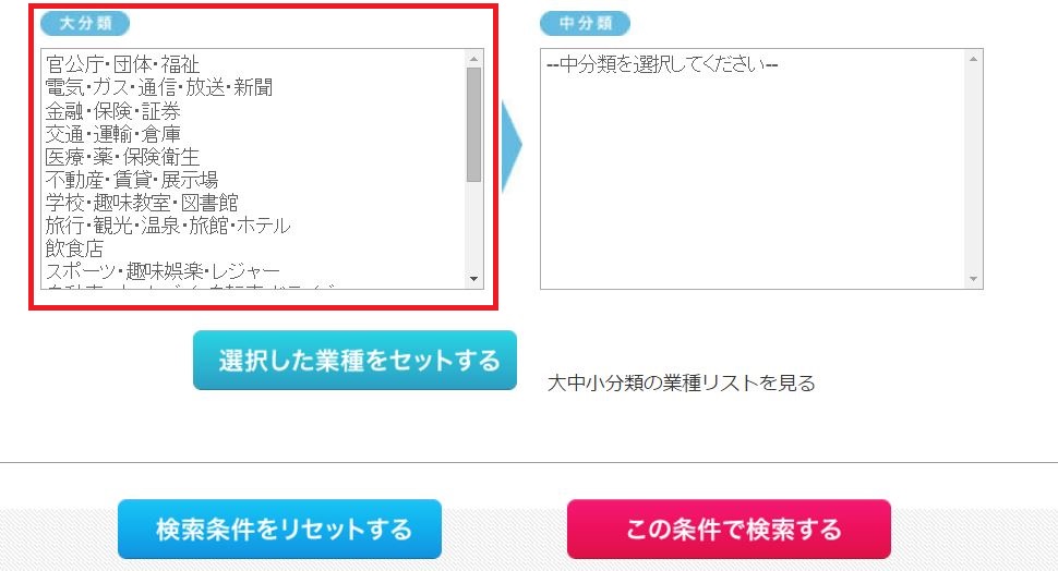 中分類まで選択すると、「選択した業種をセットする」ボタンを押すことができ、検索が可能です。