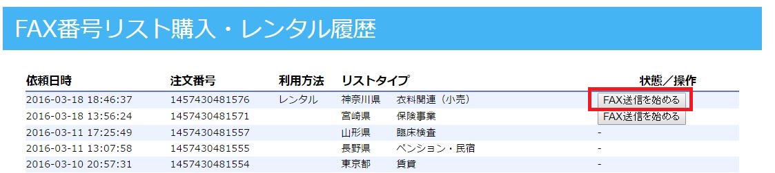 先ほどレンタルしたリストの「FAX送信を始める」ボタンを押してください。